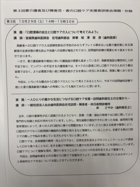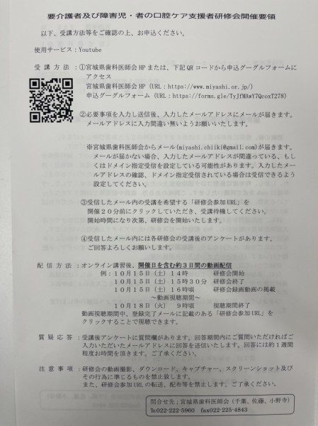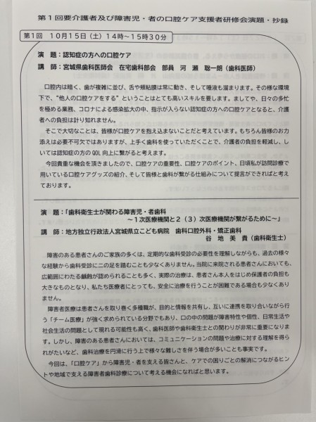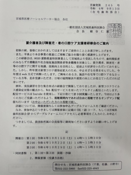 宮城県歯科医師会より、研修会のご案内が届きました。